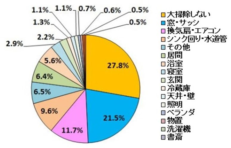 大掃除の中で重点的に掃除するのは「窓・サッシ」が一番で、21.5%。次いで「換気扇・エアコン」「シンク回り・水道管」などとなっています。