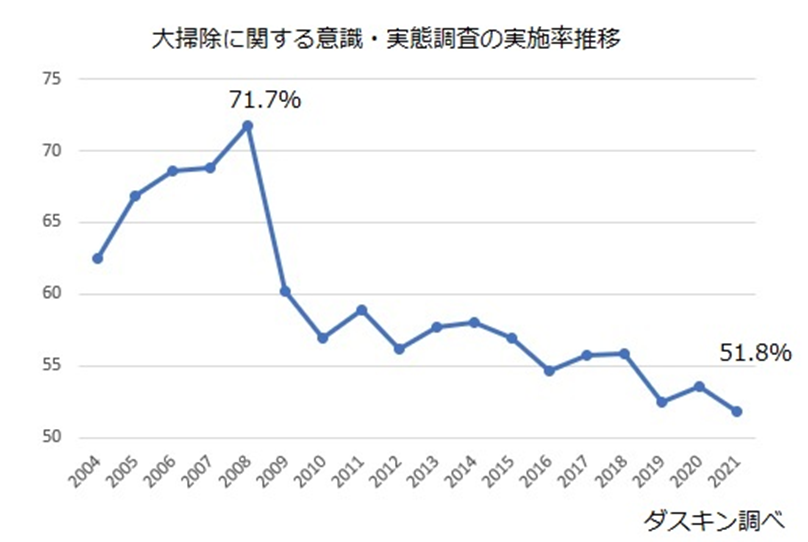 ハウスクリーニング大手のダスキンが2004年末から毎年実施している「大掃除に関する意識・実態調査」によると、大掃除の実施率は下がり続けており、2022年に発表された第18回調査(2021年末実施、対象:20歳以上の男女4,160人)では、実施率は51.8%と調査開始以来の最低を記録したそうです。
