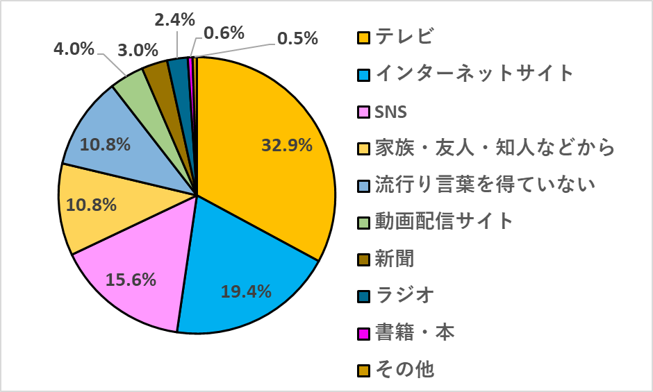 流行り言葉の情報源については、「テレビ」が32.9%、「インターネットサイト」が19.4%、「SNS」が15.6%という結果になりました。