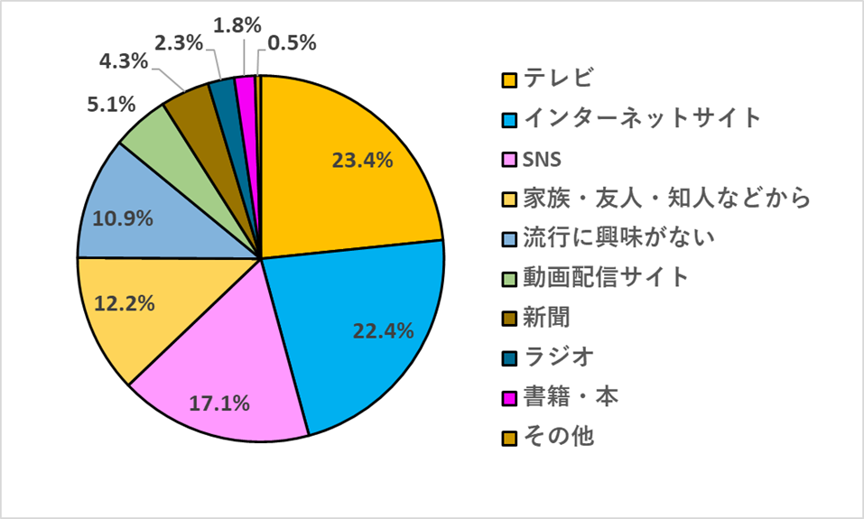 流行りものの情報源については、「テレビ」が最も多く23.4%、次いで「インターネットサイト」が22.4%、「SNS」が17.1%いう順になりました。手軽に見られるテレビやインターネットサイトから情報を得ている人が多いようですね。