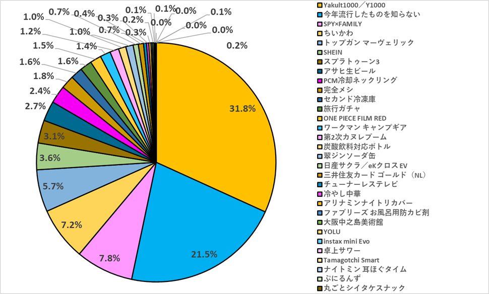 最も今年流行したものについては、「Yakult1000/Y1000」が最多で31.8%、「SPY×FAMILY」が7.8%、「ちいかわ」が7.2%という順になりました。流行語大賞のトップ10にも選ばれたヤクルト1000が最も票を集める結果になりました。