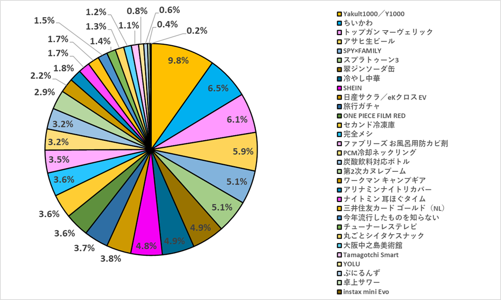 流行したものについて知名度を調べたところ、最も多い回答は「Yakult1000/Y1000」で9.8%、次いで「ちいかわ」6.5%、「トップガン マーヴェリック」が6.1%という結果になりました。どれも票がばらけましたが、先ほどの「最も今年流行したものはなんだと思いますか?」でも1位だった「Yakult1000/Y1000」の知名度が高いことが分かりました。