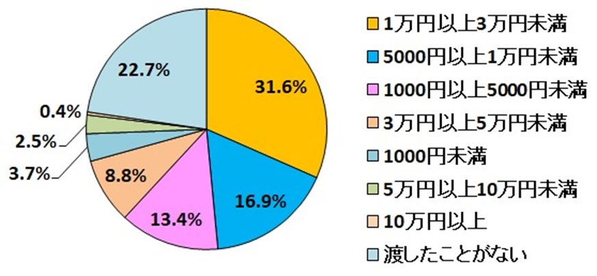 1年にあげた金額の総額は、「1万円以上~3万円未満」が1位で31.6%。「渡したことがない」人を除いた773人を分母にすると、40.9%になります。