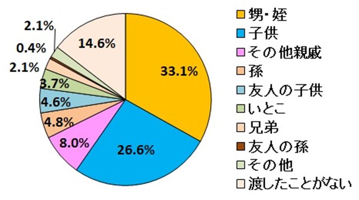 お年玉をあげた相手で最も多かったのは「甥・姪」がトップで33.1%。次いで「子供」が26.6%でした。「その他の親戚」や「孫」などはぐんと比率が下がります。