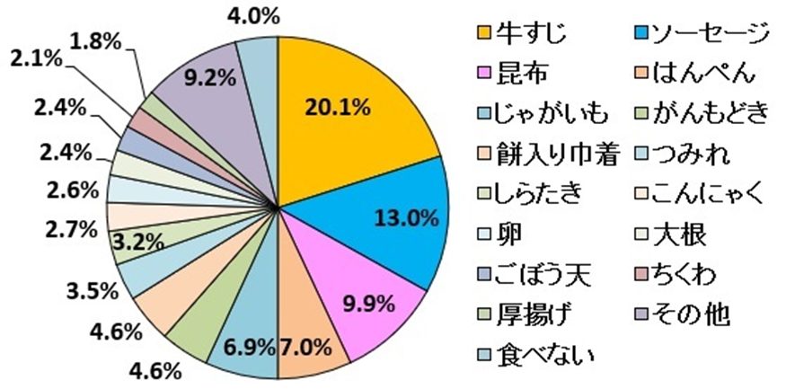 前問とは逆に食べない具材のトップは「牛すじ」で、20.1%。好きな具材ほど突出しておらず、「ソーセージ」(13.0%)、「昆布」(9.9%)、「はんぺん」(7.0%)などが続いています。