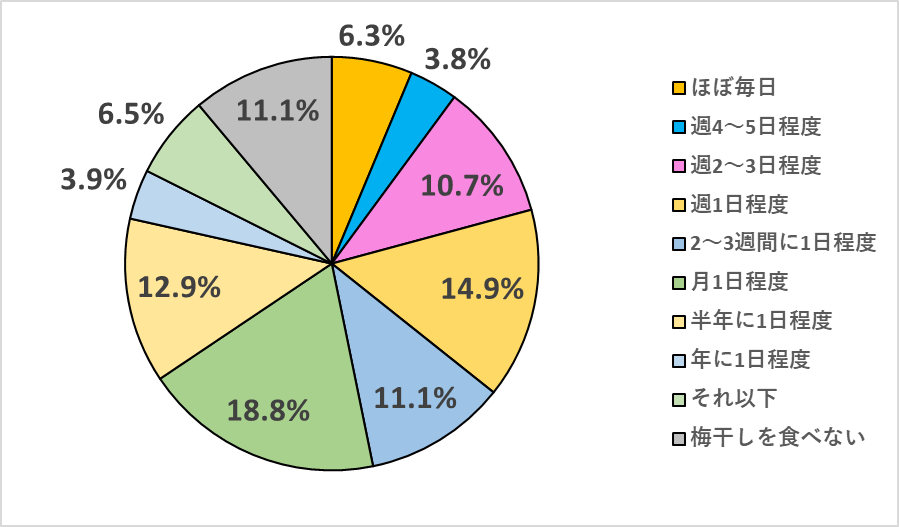 「どのくらいの頻度で梅干しを食べますか?」の質問については、「月1日程度」18.8%が最多の回答となりました。