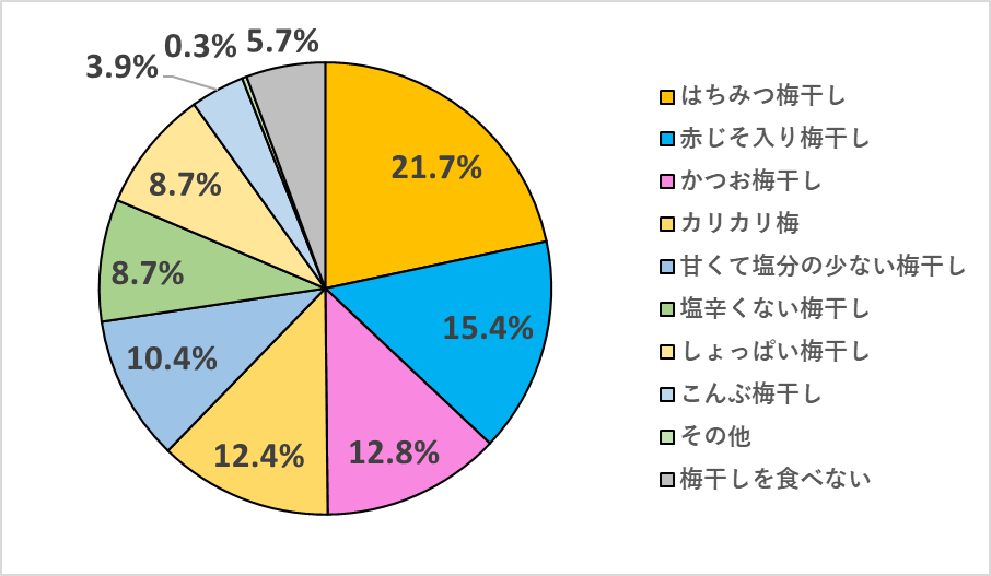 「好きな梅干しの味は何ですか?」の質問については、「はちみつ梅干し」21.7%が最多の回答となりました。