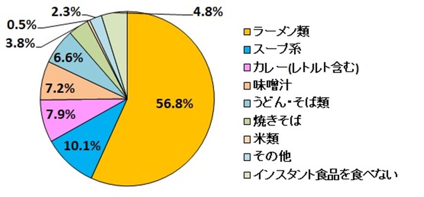 インスタント食品で最もよく食べるのは「ラーメン類」で56.8%。「スープ系」(10.1%)など2位以下を大きく引き離しています。