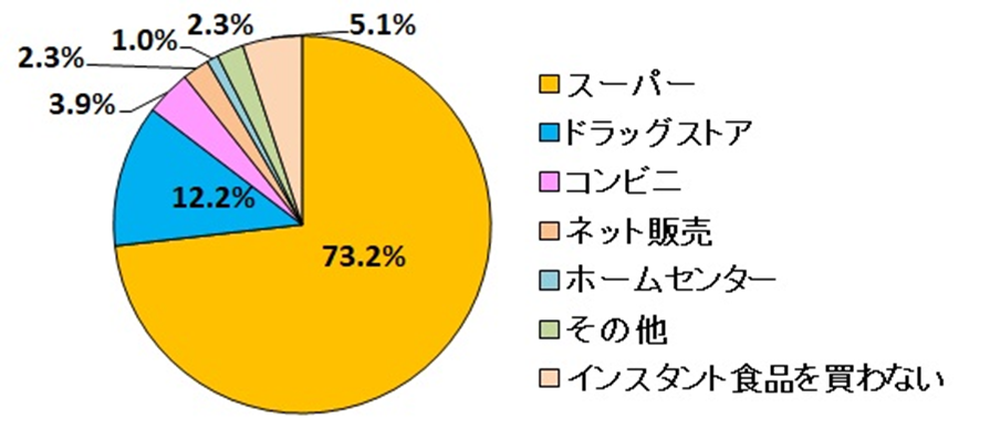 インスタント食品を購入する場所は「スーパー」が圧倒的に多くて73.2%。2位が「ドラッグストア」(12.2%)はちょっと意外ですね。