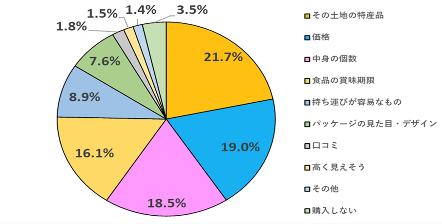 お土産を選ぶ際、気にすることはありますか?という質問で最も多かったのは「その土地の特産品」で21.7%、次いで「価格」で19.0%、「中身の個数」で18.5%となりました。旅行に行った先の思い出話と共にお土産を渡すのであれば特産品であるということは譲れない条件になるでしょう。「価格」と「中身の個数」ではコスパの意識が強く働いていますね。前述した会社やサークルなどのコミュニティで大人数にお土産を配ることを考えたら必然的な結果でしょう。
