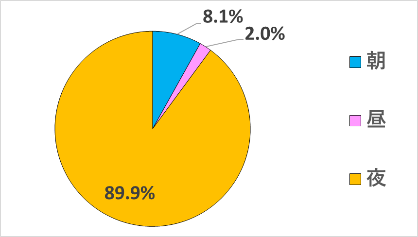 シャンプーをするタイミングは「朝」が8.1%で「昼」が2.0%、「夜」が圧倒的に多く89.9%となっています。一時期「朝シャン」という言葉が流行って朝からシャンプーをする人が増えたようですが、基本的には日中仕事をして、その汚れを夜の入浴時に落とすのでしょう。