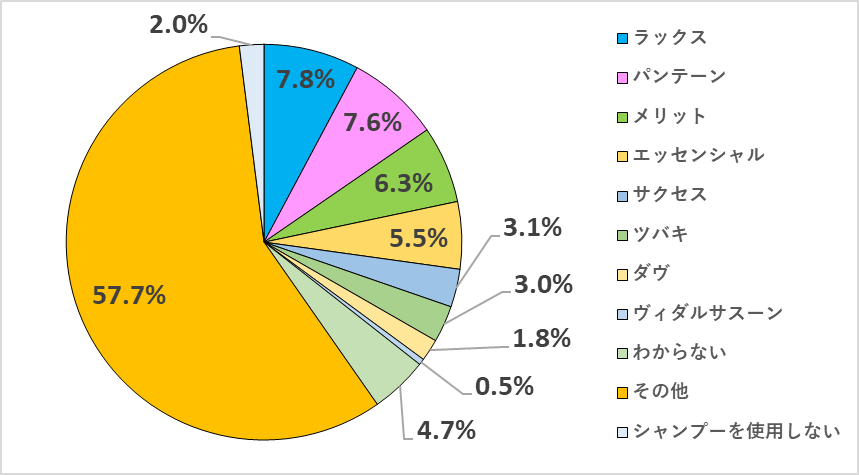 その他の57.7%を除くと、最も「ラックス」が多く7.8%、「パンテーン」が7.6%、「メリット」が6.3%となっております。意外と銘柄別では差が見られませんね。みなさん、ネームバリューではなく、それぞれのこだわりでシャンプーを選んでいるのでしょうね。