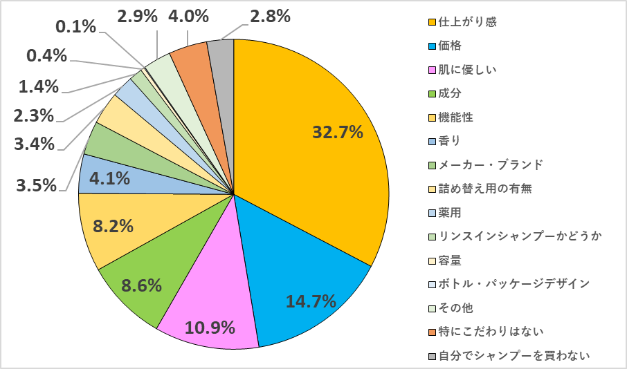 「仕上がり感」が圧倒的に重要視されています。他を大きく突き放して32.7%となっています。そして次に「価格」が14.7%、「肌に優しい」が10.9%、「成分」が8.6%、「機能性」が8.2%と続いています。やはりシャンプーの後は気分良くなりたいということでしょう。