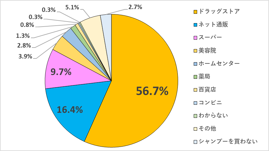 「ドラッグストア」でシャンプーを購入される方が56.7%となっています。ドラッグストアは簡単な食料品からインスタント食品まで幅広く揃いますので、便利なのでしょう。次に「ネット通販」が16.4%となっています。シャンプーは重いのでネット通販が便利なのでしょう。使ったことがある銘柄であればネット通販で購入しても安心ですから。続いて「スーパー」が9.7%です。