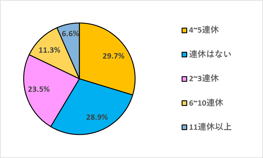 「今年のGWは何連休予定ですか?」という質問に対し、「4~5連休」が29.7%、次いで「連休はない」が28.9%、「2~3連休」が23.5%という順になりました。4~5連休の人が多いようですが、連休はない人も同じ位いらっしゃることが分かりました。