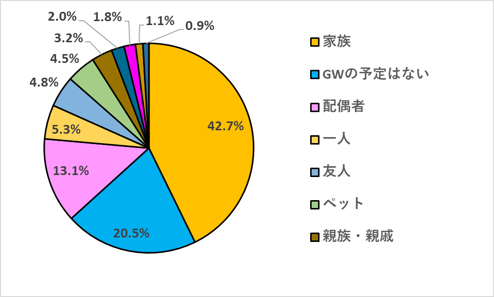 「今年のGWは、誰と過ごす予定ですか?」という質問を複数回答可で行ったところ、「家族」が42.7%、次いで「GWの予定はない」が20.5%、「配偶者」が13.1%という順になりました。家族で過ごされる方が4割以上のようですね。