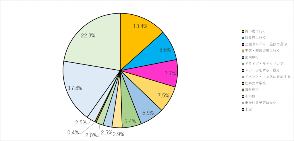 今年のGWは、どこに出かける予定ですか?」という質問を複数回答可で行ったところ、「未定」の22.3%、「出かける予定はない」の17.8%を除くと、59.9%の方が既にお出かけ先を決めていることがわかります。 その中では13.4%の「買い物に行く」が最多で、次いで「飲食店に行く」(8.6%)、「公園やレジャー施設で遊ぶ」(7.7%)、「実家・親戚の家に行く」(7.5%)、「国内旅行」(6.9%)という結果になりました。