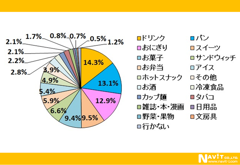 18品目を挙げて何を購入することが多いかを複数回答可で質問したところ、トップ3は「ドリンク」の14.3%、「パン」13.1%、「おにぎり」12.9%という結果になりました。