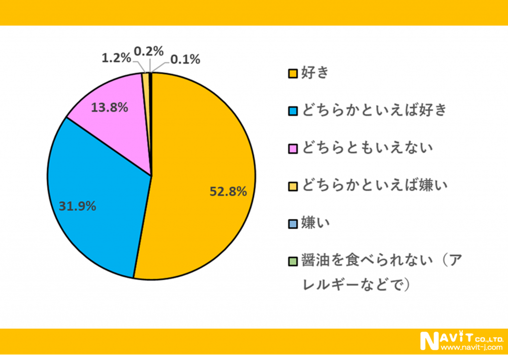 醤油が好きかどうかについては、「好き」が52.8%、「どちらかといえば好き」が31.9%という結果になり、合わせると8割以上の人は、醤油が好きだと分かりました。