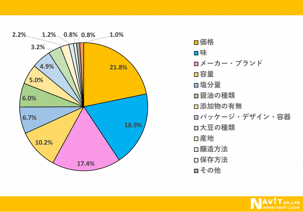 「醤油を購入する際、重要視していることは何ですか?」という質問を複数選択可能で行ったところ、「価格」が21.8%、「味」が18.9%、「メーカー・ブランド」が17.4%という順になりました。価格重視の方が多いようですね。