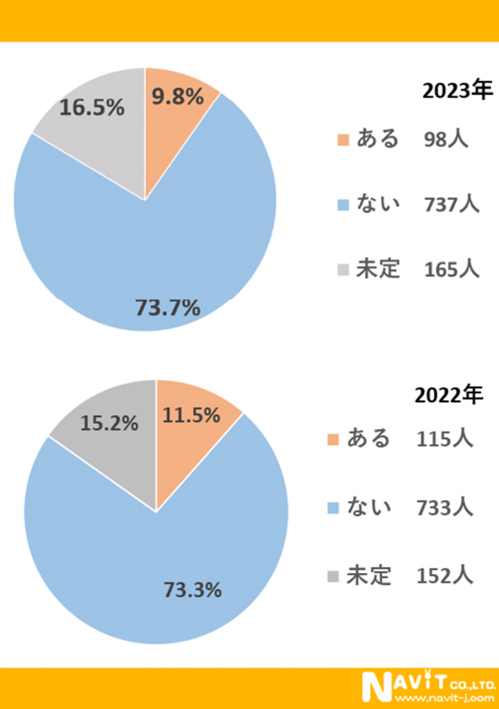 「今年の夏、海に行く予定はありますか?」のアンケートに対して「ある」が9.8%で前年(11.5%)よりも1.5%減少しています。前年の調査からの数値の変化は微差と言っていい程度の差になっていますが、アンケートを実施したのが5月だったためか、昨年より1.5%減少する結果となりました。