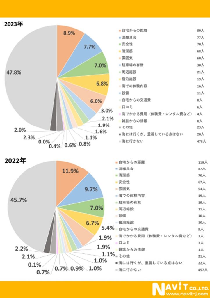 「どこの海に行くかを決める際、一番重要視している点は何ですか?」という質問では、「自宅からの距離」が8.9%と最も高く前年(11.9%)よりも3%も減少しています。次に「混雑具合」7.7%が前年(9.7%)から2%減少しています。次いで昨年4位だった「安全性」7.0%は前年(6.7%)から0.3%増加しております。