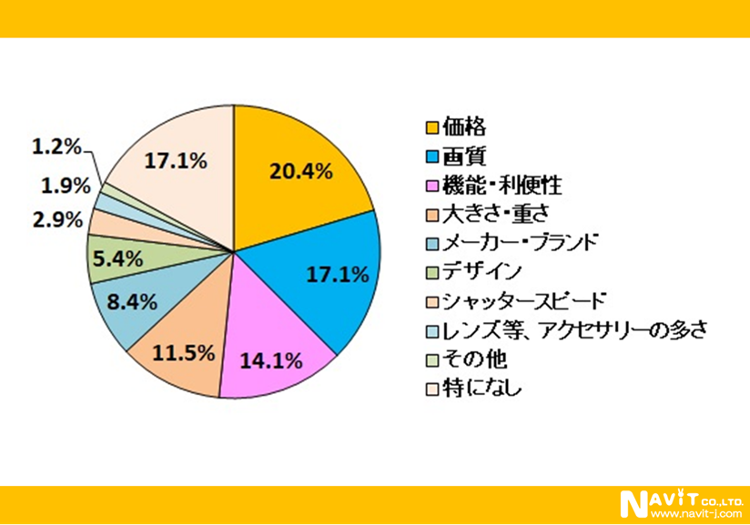 デジカメを選ぶときのポイントは「価格」「画質」「機能・利便性」のトップ・スリーを合わせると、回答数の51.6%を占めています。「メーカー・ブランド」で選ぶ人は回答数の8.4%にとどまっています。