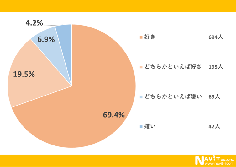 コーヒーが「好き」という方が最も多く69.4%です。次に「どちらかといえば好き」という方が19.5%で合わせて88.9%と実に9割近い方がコーヒーに対して好意的です。「どちらかといえば嫌い」という方も6.9%いらっしゃいます。