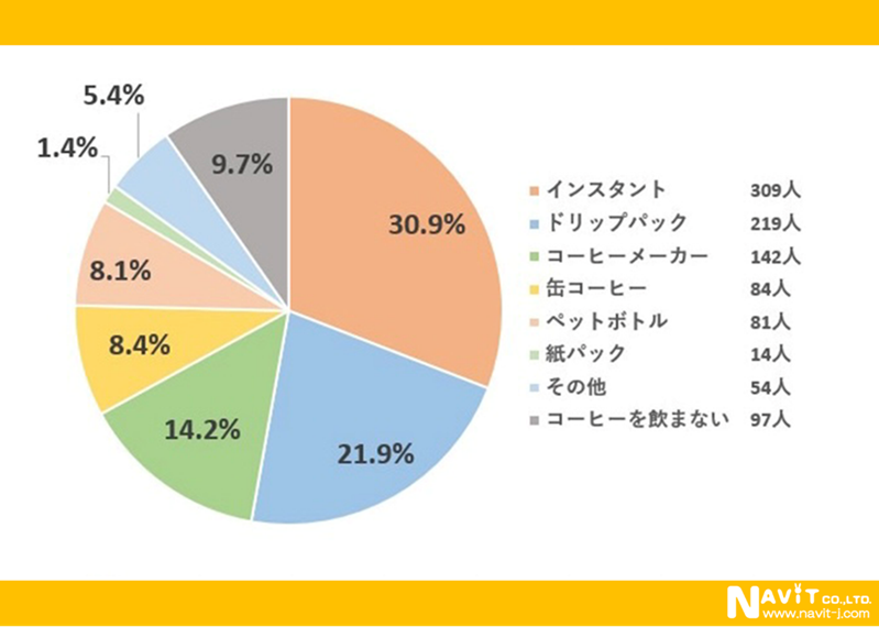 日常的に飲まれているコーヒーには様々なタイプがあります。その中で一番飲まれているのは「インスタント」が一番多く30.9%となっています。続いて「ドリップパック」というマグカップなどの上に乗せてお湯を注ぐタイプが21.9%です。「コーヒーメーカー」が3番目で14.2%となっています。