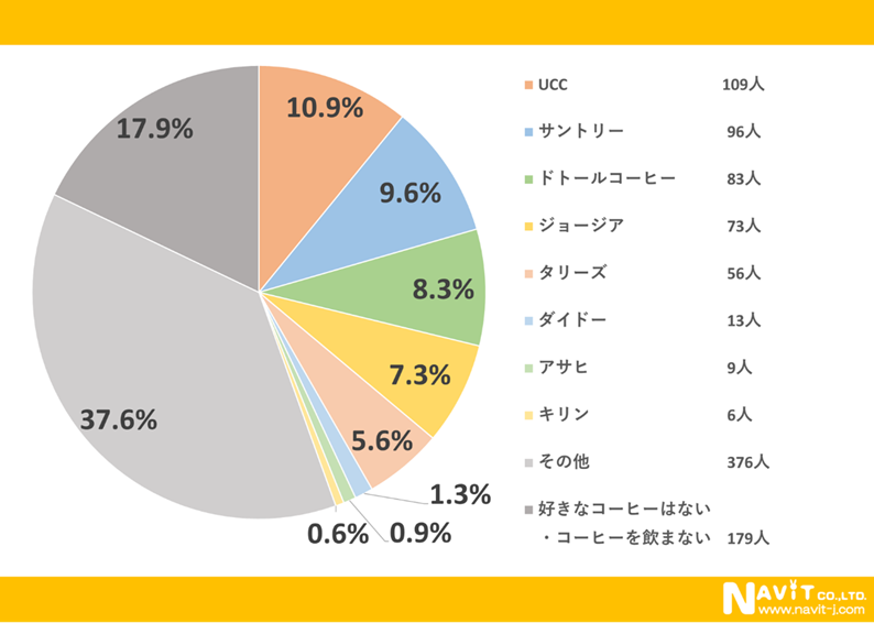 かなり結果が分散しましたが、このアンケートで最も多かったのは「その他」を除き、缶コーヒーの老舗である「UCC」が10.9%、「サントリー」が9.6%、「ドトールコーヒー」が8.3%と続いています。コーヒーにはご当地のものから大手メーカーまで数多くの種類があります。みなさんこだわりがあることがわかります。
