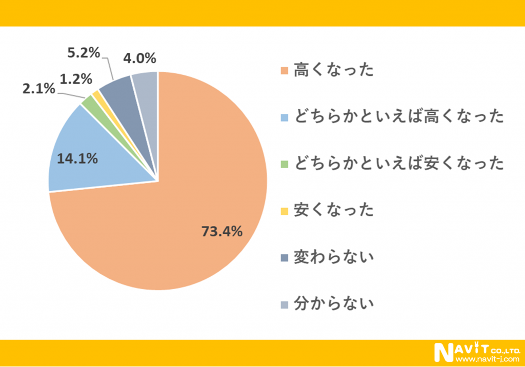 「昨年より電気代の支払額が高くなりましたか?」の質問については、「高くなった」が73.4%、「どちらかといえば高くなった」が14.1%で、合わせると9割近くの人が電気代の支払額が高くなったことがわかります。