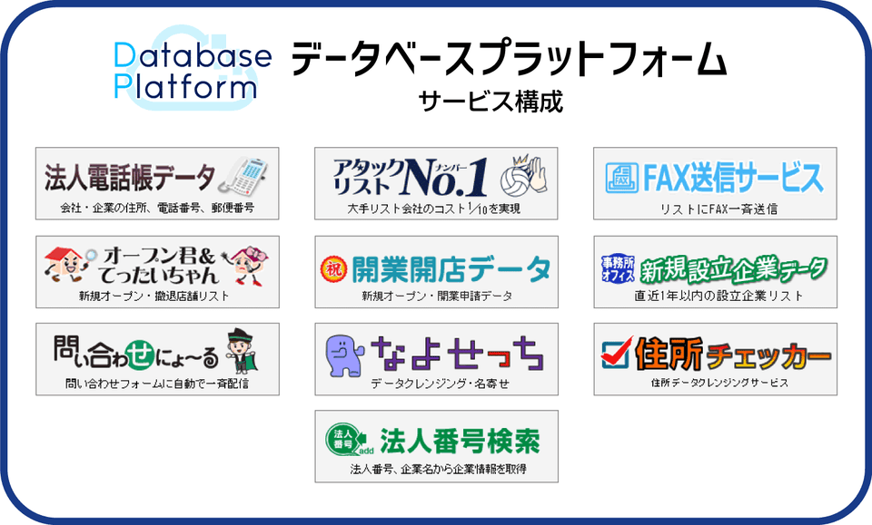 法人電話帳データ、アタックリストNo.1、開業開店データ、FAX番号リスト送信サービスといった