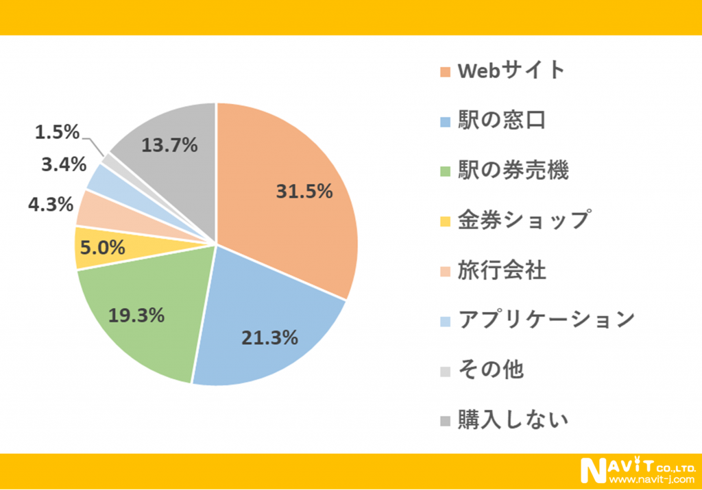 新幹線の切符購入場所については、「Webサイト」が31.5%、「駅の窓口」が21.3%、「駅の券売機」が19.3%という結果になりました。