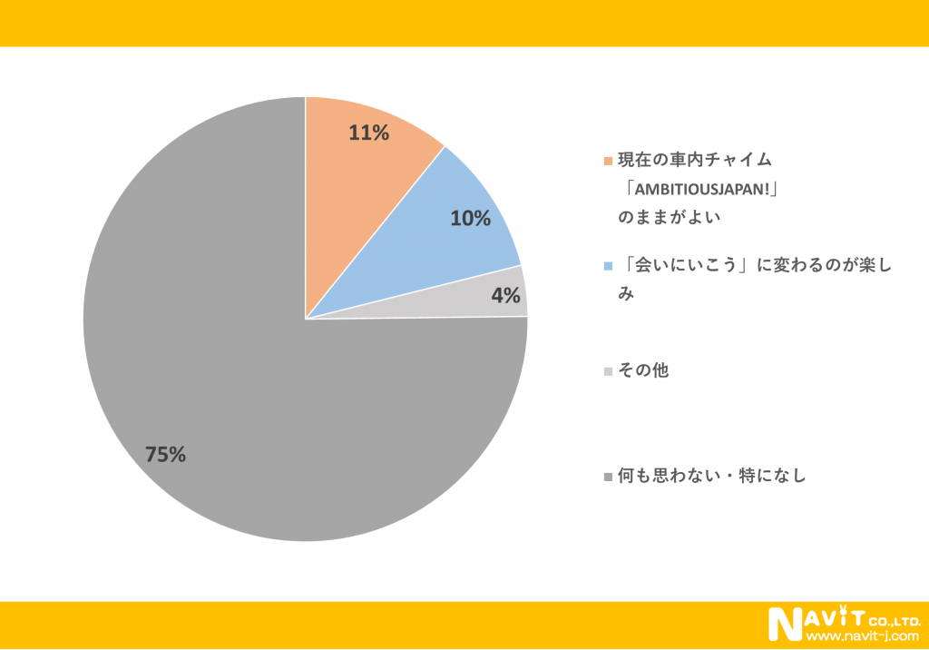 「新幹線の車内チャイムが変更になることをどう思いますか?」という質問については、「現在の車内チャイム“AMBITIOUSJAPAN!”のままがよい」が10.8%、「“会いにいこう”に変わるのが楽しみ」が10.3%とほぼ同数程度に分かれる結果となりました。