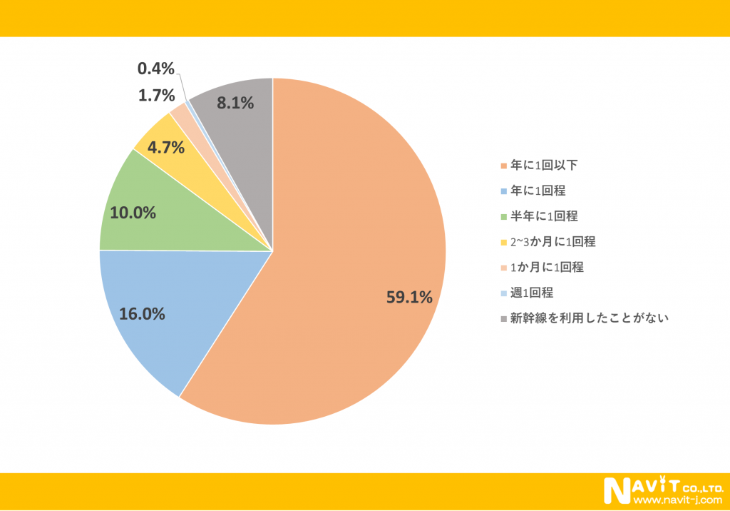 新幹線の利用頻度については、「年に1回以下」が59.1%、「年に1回程」が16.0%、「半年に1回程」が10.0%、「2~3か月に1回程」が4.7%という順になりました。