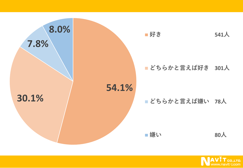 キムチが「好き」という方と「どちらかというと好き」という方が合わせて84.2%もいらっしゃいます。「好き」という方だけでも54.1%もいらっしゃるので、大半の方がキムチが好きだということがわかります。