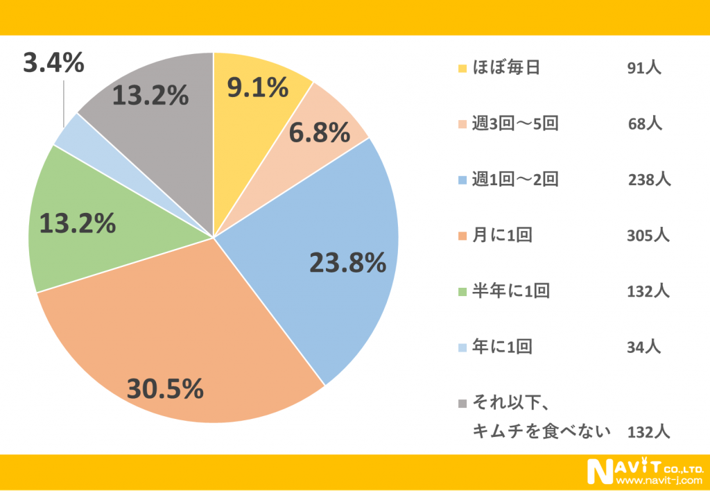 キムチを「月に1回」程度食べるという方が30.5%と一番多くなっています。次に「週に1回〜2回」という方が23.8%です。「半年に1回」という方が13.2%と続いています。