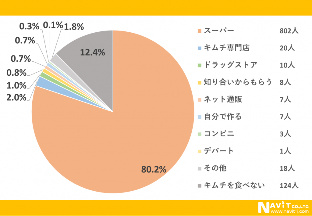 キムチを購入する場所で一番多いのは「スーパー」で80.2%と大多数となっています。次に「キムチ専門店」が2.0%です。キムチ専門店は地域によって無いこともあるので、やはりスーパーで買うことが多くなるのでしょうね。