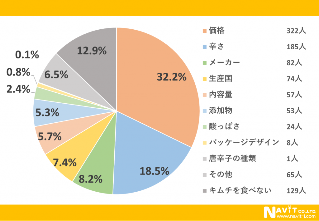 キムチを買う基準については回答がばらつきました。一番多かったのが「価格」で32.2%となっています。次に「辛さ」が18.5%です。やはり辛いものを食べたい時にキムチを食べたくなるのでしょうか。そして、「メーカー」が8.2%と続いていいます。