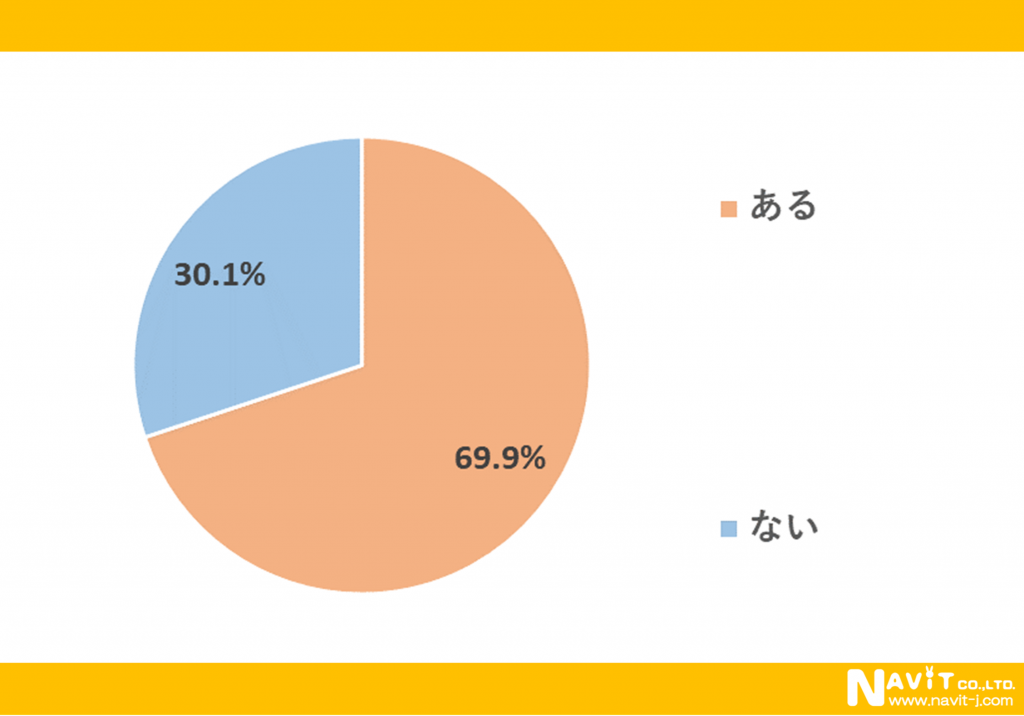ダイエット(減量)をしたことがあるかどうかについては、「ある」が69.9%、「ない」が30.1%となり、7割近い人にダイエット経験があることが分かりました。
