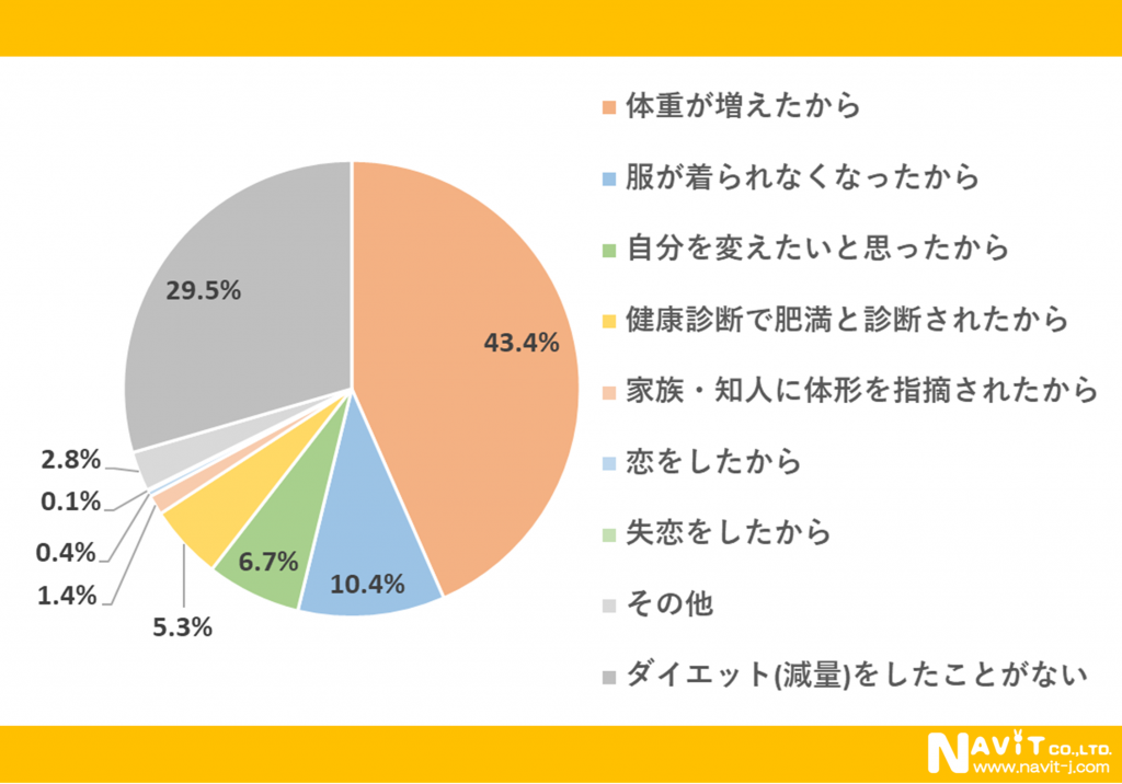 ダイエット(減量)を始めた理由については、「体重が増えたから」が43.4%、「服が着られなくなったから」が10.4%、「自分を変えたいと思ったから」が6.7%という順になりました。