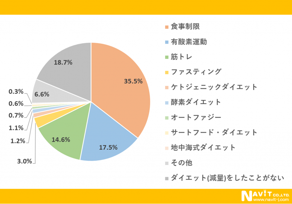 「どのようなダイエット(減量)をしましたか?」という質問を複数回答可で行ったところ、「食事制限」が35.5%、「有酸素運動」が17.5%、「筋トレ」が14.6%という順になりました。