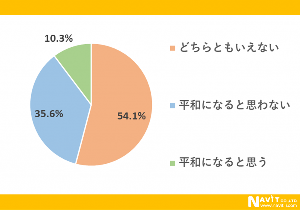 「あなたが生きている間に、日本が完全に平和になると思いますか?」という質問については、「どちらともいえない」が54.1%、「平和になると思わない」が35.6%、「平和になると思う」が10.3%という結果になりました。