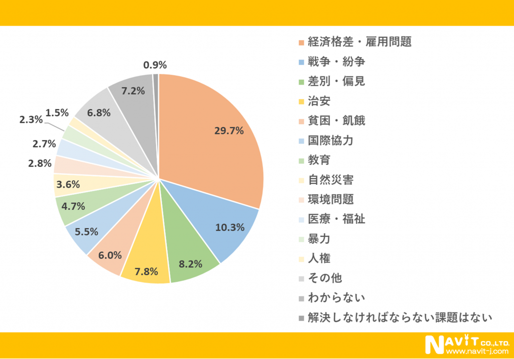 日本が平和になるために、最も解決しなければならない課題は、「経済格差・雇用問題」が最多
