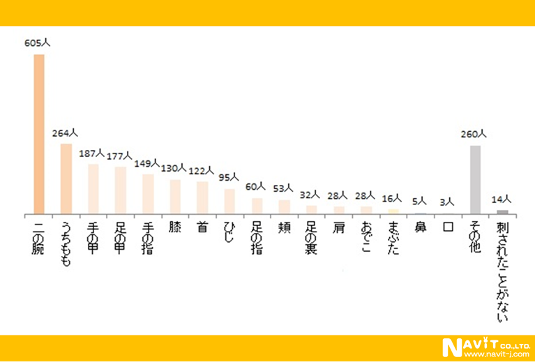 次いで多いのは「うちもも」264人、「手の甲」187人、「足の甲」177人などですが、刺される箇所は「露出しているところはほぼ全身」との印象です。