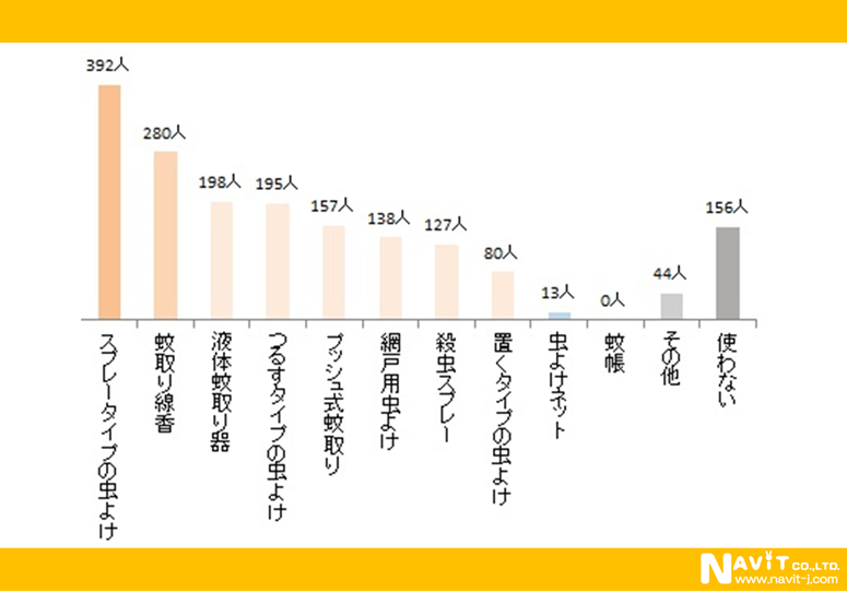 虫よけ対策のトップは「スプレータイプの虫よけ」で、392人。昔ながらの「蚊取り線香」の人気も高くて、280人で2位に入っています。
