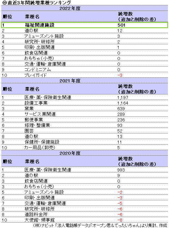 新たにランキング入りした「福祉関連施設」のみが大幅に純増しています。