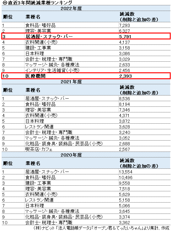 直近3年間で減った業種ランキング