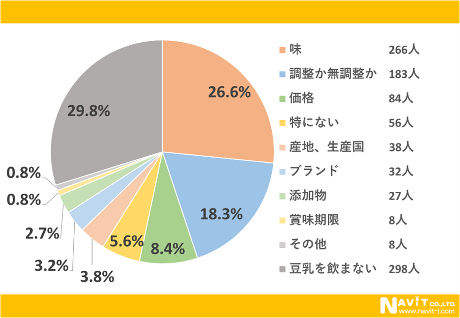 豆乳を選ぶ際の基準は「味」という方が26.6%と最も多くなっています。次に「調整か無調整か」で選んでいる方が18.3%です。次にずいぶん下がって「価格」で8.4%となっています。