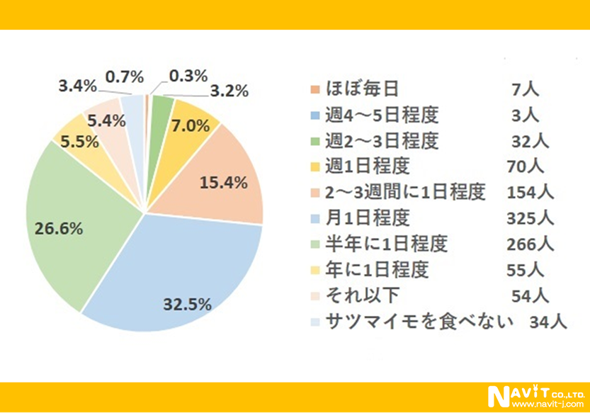 サツマイモを食べる頻度は「月1日程度」が最も多くて、325人。「半年に1日程度」(266人)、「2~3週間に1日程度」(154人)がこれに続いており、好きな人が多いにもかかわらず、食べる頻度はあまり多くないですね。
